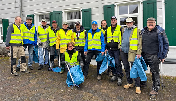 Die Helfer vom VVS ließen sich durch den Regen nicht vom Müllsammeln abhalten. Sie haben die Frauenstraße und Breite Straße gesäubert wie in jedem Jahr. Nicht auf dem Foto sind Christel und Erich Fischer, die für den VVS an der Zeithstraße sammelten und dann beim gemeinsamen Mittagessen dabei waren. Hier sei auch den Frauen gedankt, die für die Verpflegung gesorgt hatten. Foto: Hans-Peter Krieger |
