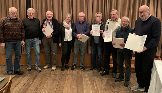 Im gemütlichen Dorfhaus Kurtsiefen fand am 02. April die diesjährige Mitgliederversammlung des VVS statt. Im Zentrum der Veranstaltung stand diesmal das Engagement des Vereins für Umwelt- und Naturschutz und die Erhaltung der biologischen Vielfalt, z.B. durch das Anlegen einer Wildblumenwiese im Bicester Park. Da der VVS ein Traditionsverein ist, konnten auch wieder einige Mitglieder für 40-jährige Mitgliedschaft geehrt werden. So nahmen Heinrich Ratz, Anita Rauen, Wolfgang Sapp, Burkard Sondermeier und das Ehepaar Wüstefeld ihre Urkunden entgegen. Mit einem Gedankenaustausch beim gemütlichen Beisammensein endete die Versammlung. |